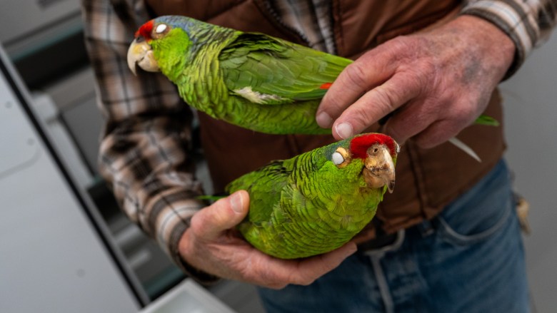 Philip Unitt showcases preserved parrots in the Natural History Museum’s bird archive. (Photo by Thomas Murphy/Times of San Diego)
