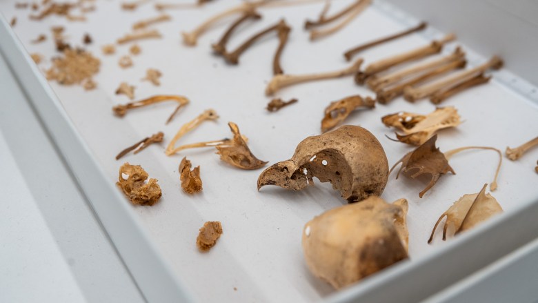 Bird bones on a collection tray. (Photo by Thomas Murphy/Times of San Diego)