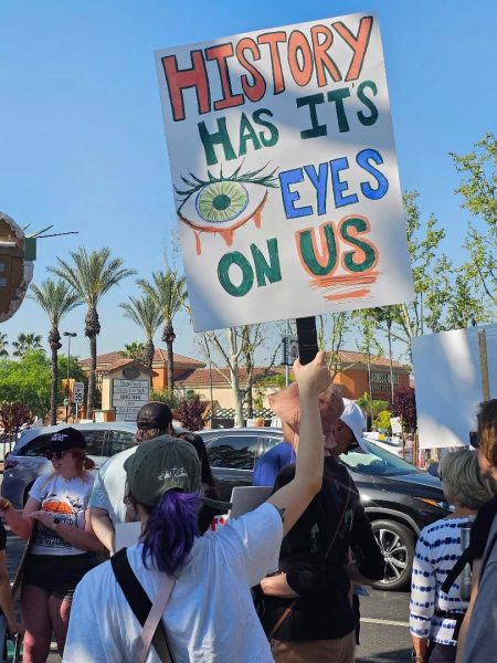 One protester holding a sign that says, “History has its eyes on us” expressing the significance of current affairs during the No Kings protest by River Park on March 28. (Photo by: Kenneth S. Fulton)