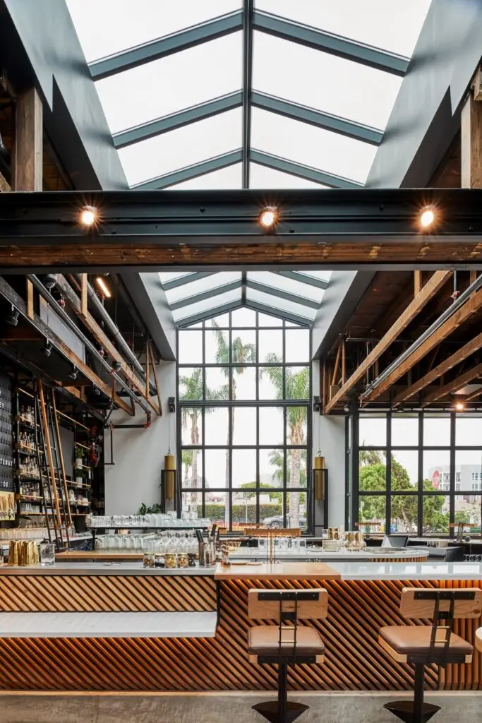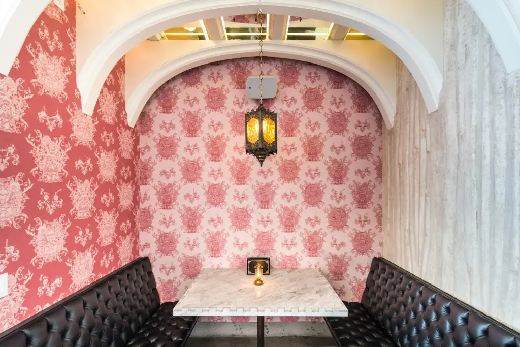 “Kindred is one of those interiors people in San Diego remember—[it’s] bold, moody, and unapologetically its own. I was drawn to this booth vignette because it captures that signature contrast: black tufted seating against pink patterned walls, framed by repeating arches and reflective ceiling panels that amplify the lantern glow. When I photograph restaurants, I focus on more than wide angles. I look for intimate moments where the design language is distilled into a single frame. This is where the personality of a space lives—in the textures, color, and atmosphere guests experience up close.”