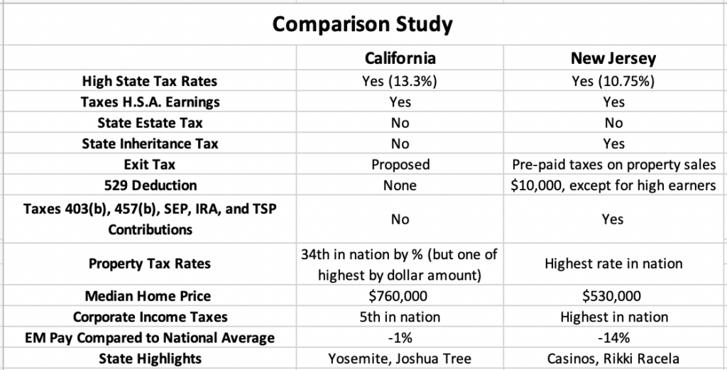We knew we wanted to be on the coast, but we weren’t 100% sure on which coast we wanted to be. Our choices came down to California or New Jersey. We weighed the factors carefully, as you can see in the chart below.