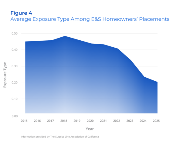 Crucially, this transition is reinforced on every dimension of wildfire‑related risk. Risk to homes is falling to record lows (Figure 2), exposure type continues to decline (Figure 4) and the E&S book has become overwhelmingly urban (Figure 3). These trends all point in the same direction: The homes entering surplus lines are becoming less hazard‑exposed and more metropolitan.