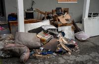 As of April 1, burn marks are visible in front of one of the buildings and along its balcony, as well as piles of burnt and damaged belongings and furniture. Most of the buildings’ doors and windows have been boarded up with plywood.
