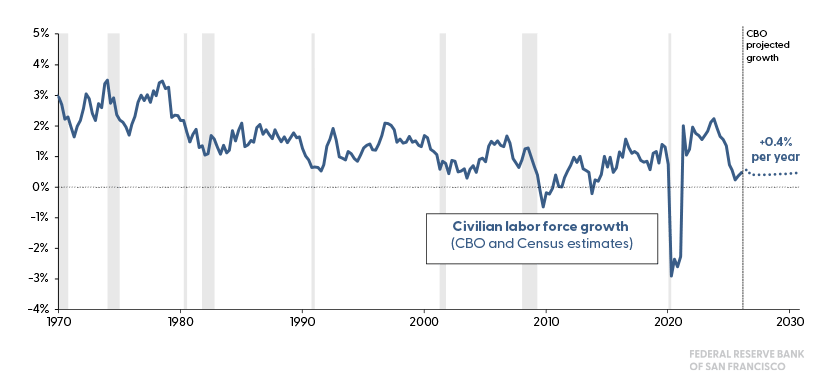 1. The Congressional Budget Office (2026a) projects that labor force growth will average 0.4 percent per year over the coming decade, primarily reflecting the aging of the population. In addition, they project a decline in the labor force participation rate owing to the retirement of members of the baby boom generation and Generation X.