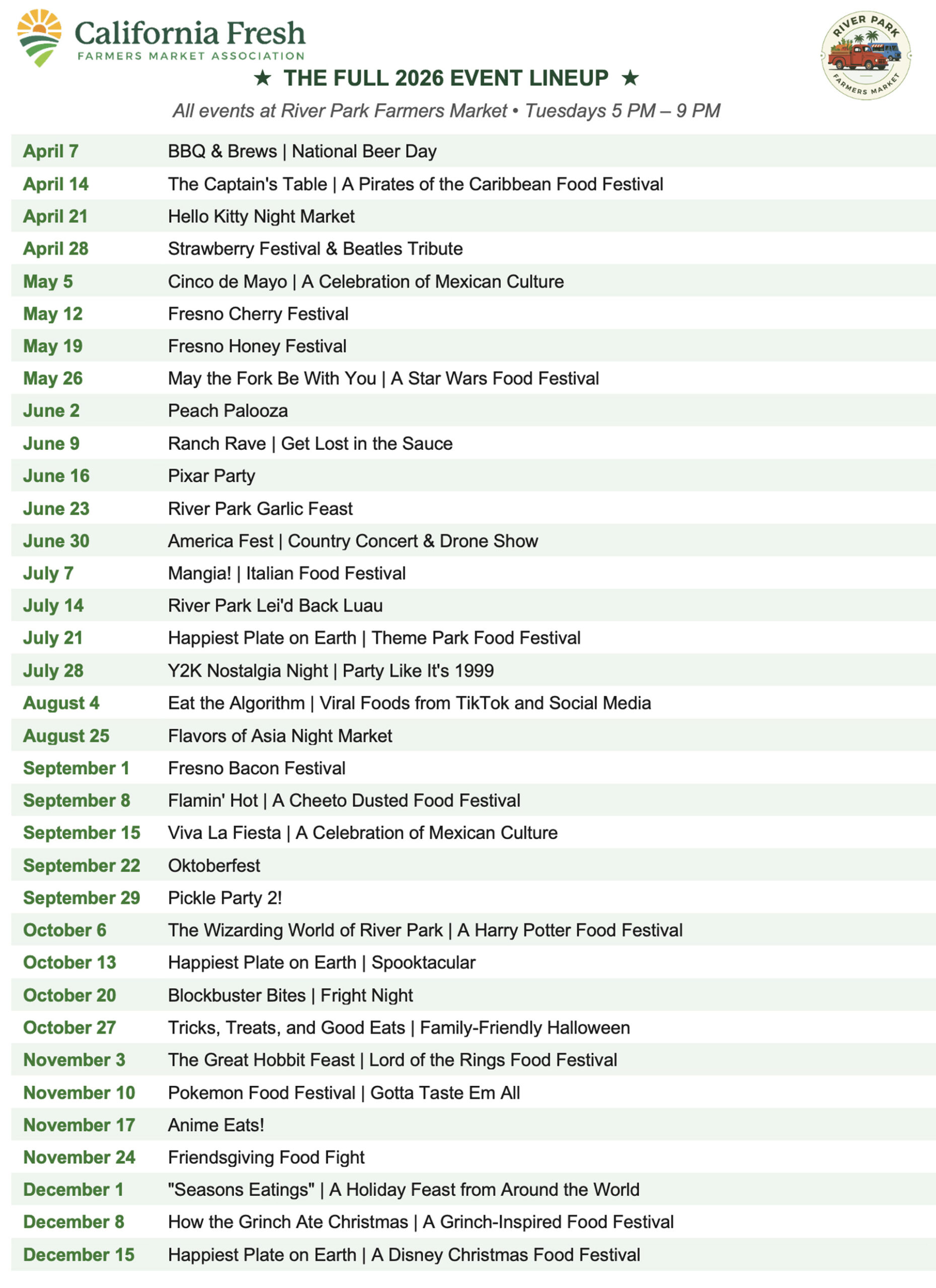 River Park Farmers Market 2026 calendar (California Fresh Farmers Market Association)