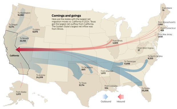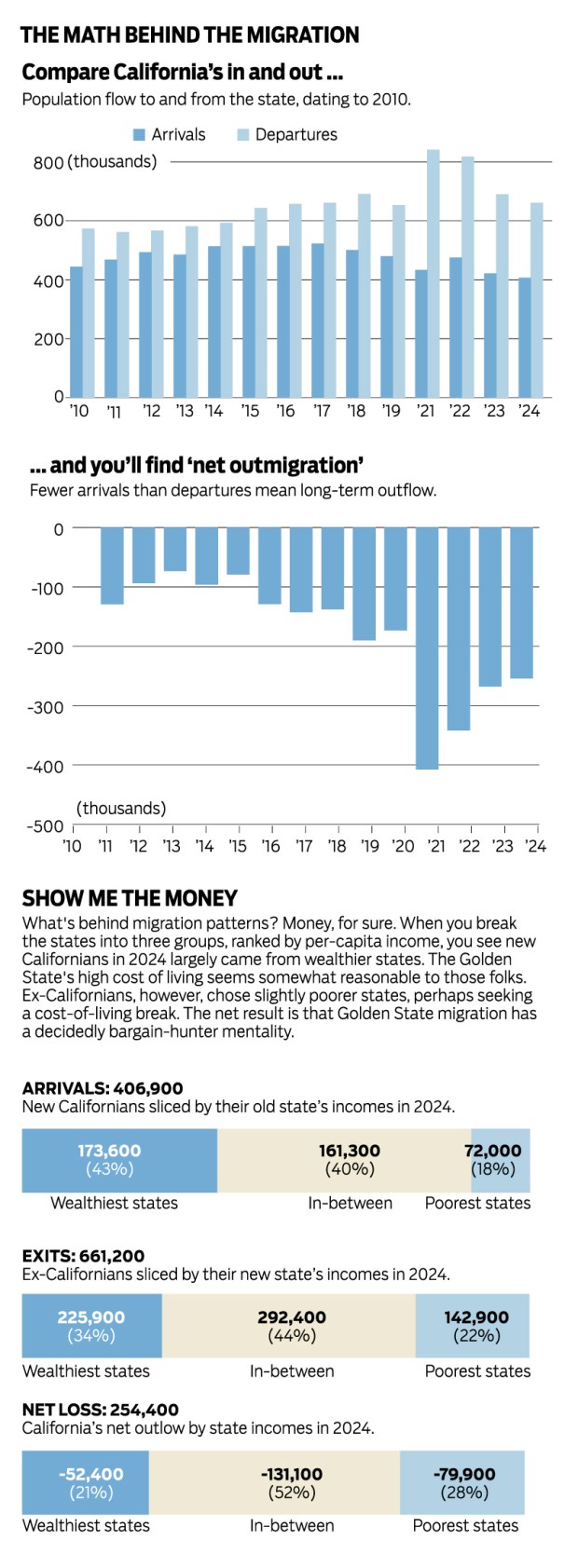 Few things fuel the grand debate about California’s economy more than population flows in and out of the Golden State. The annual interstate migration statistics from the U.S. Census Bureau give us a picture of who is moving where. Let’s focus on what demographers call “net migration “– the number of people arriving compared with the number of people departing a state. Let’s ponder recently released 2024 statistics.
