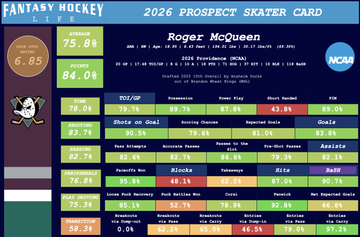 McQueen offers one of the more intriguing blends of size and offensive upside in Anaheim’s system, and his first NCAA season at Providence only reinforced that appeal. He finished third on the team in scoring, behind Chicago’s John Mustard and Montreal’s Logan Sawyer, while taking on a major role, leading all forwards in time on ice at both even strength and on the power play. He also paced the team with a 60% Corsi, highlighting his ability to tilt the ice and drive possession, not just contribute offensively. When he is playing with confidence, he controls shifts through his reach, puck protection, and net-front presence, with flashes of creativity that suggest more than a complementary ceiling.