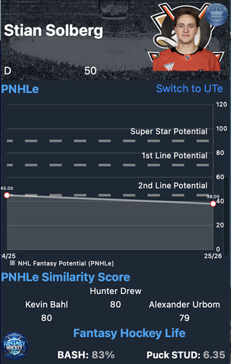 His value is very format-dependent, but in the right leagues, it could be significant. NHL Rank King pegs his pNHLe at just 38, which limits his appeal in points-only formats, but that undersells his broader impact. Solberg’s ability to close gaps, move pucks efficiently, and consistently deliver in the hits category makes him a classic multi-category asset. As Anaheim’s blue line continues to evolve, he projects as the type of defenseman who can log meaningful minutes and provide steady peripheral production, making him a strong buy for managers in leagues that reward physical play.