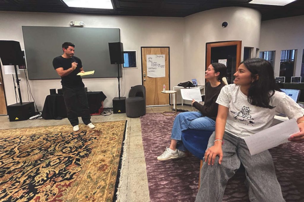 PITCH PERFECT A facilitator (left) works with entrepreneurs Chloe Hughes and Fatimah Hussain on pitching their financial advising tool for students, Finnie. (Photo by Bosko Kante & Ryan Austin)