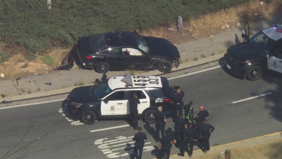 Officers with the Los Angeles Police Department were in pursuit of a possible felony suspect when the suspect’s vehicle crashed into a patrol vehicle on the southbound side of the 5 Freeway on the Olympic Boulevard off-ramp.Â