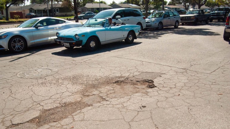 A large pothole on Washington Avenue in Fullerton on Saturday, Sept. 17, 2022. Credit: Zia Bella Blair