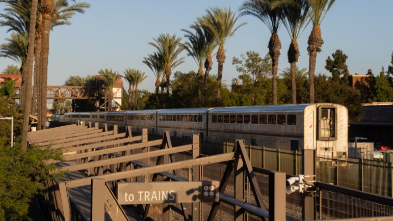 A train passes by Downtown Fullerton on Oct. 5. 2025. Credit: ERIKA TAYLOR, Voice of OC