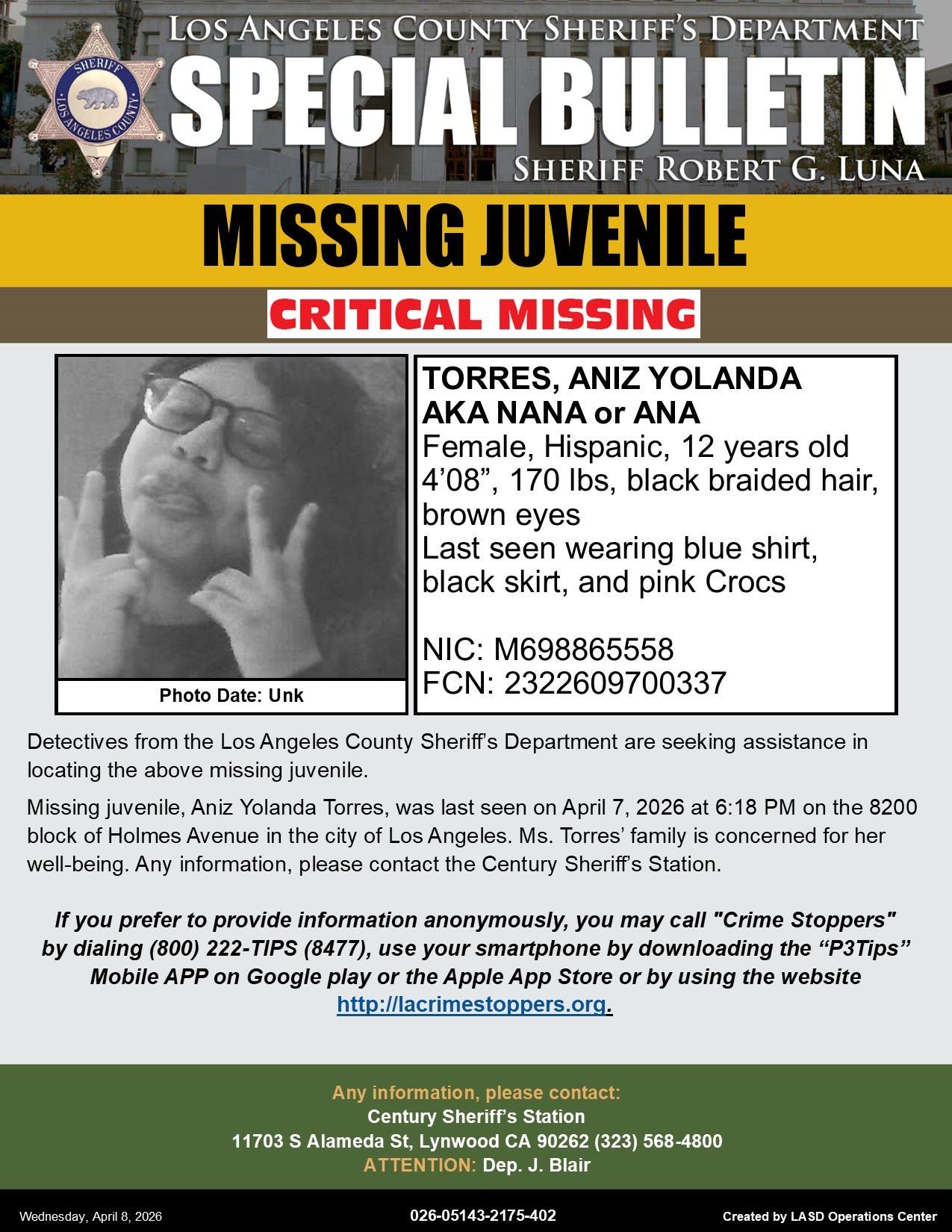 Aniz Yolanda Torres was last seen around 6:18 p.m. on April 7 on the 8200 block of Holmes Avenue, according to the Los Angeles County Sheriff’s Department.