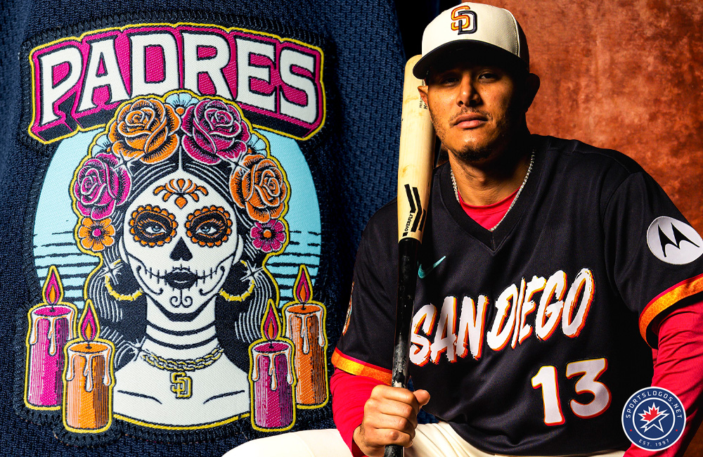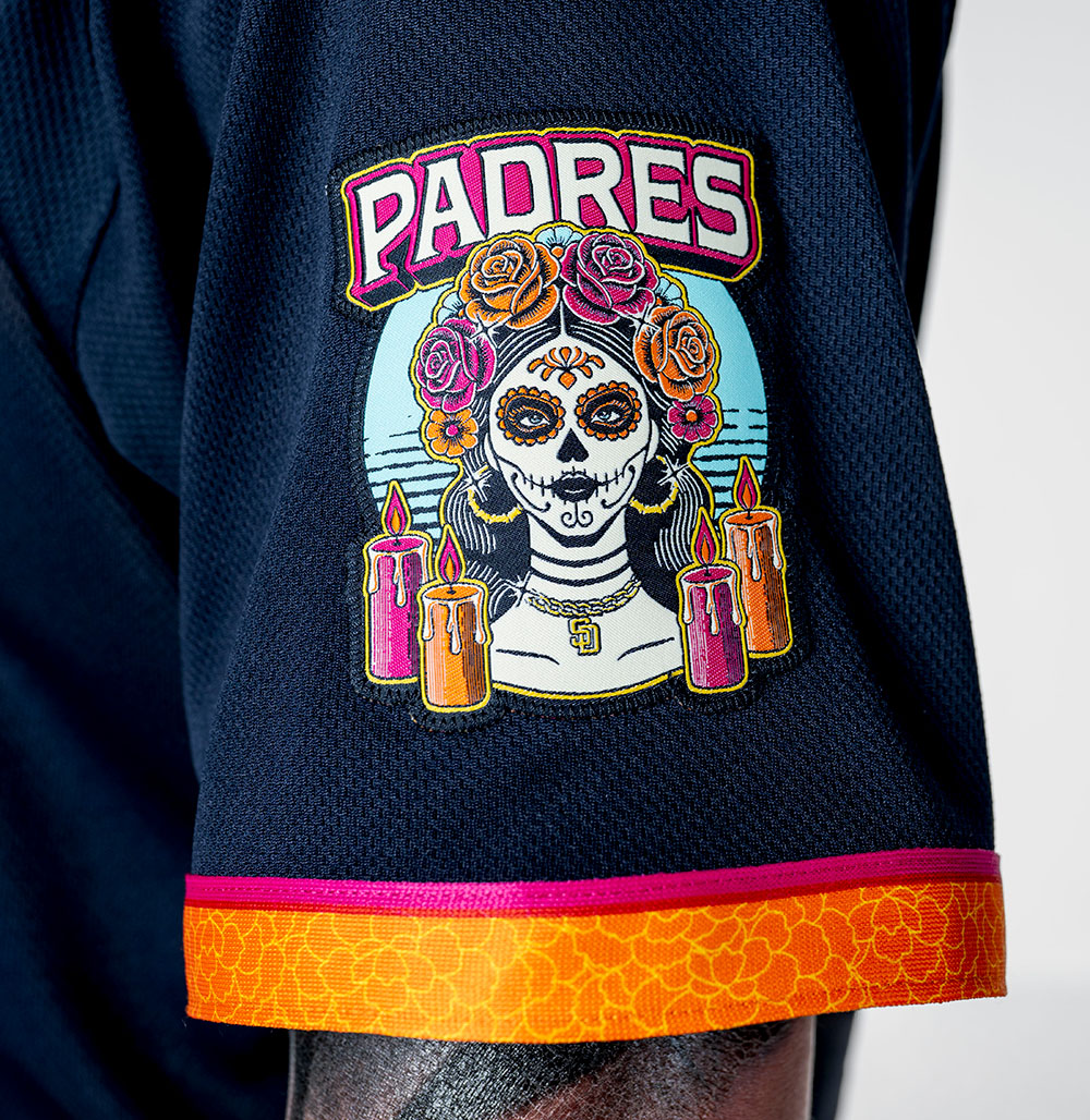 Certainly, the most prominent new addition to this uniform is the sleeve patch. The Padres have gone with a La Catrina design tied to Día de los Muertos, showing a skeletal female figure wearing a floral crown, surrounded by four ofrenda candles and set against an aqua Pacific Ocean backdrop. The club says the patch is meant to honour traditions, families, and loved ones remembered through the Día de los Muertos holiday.