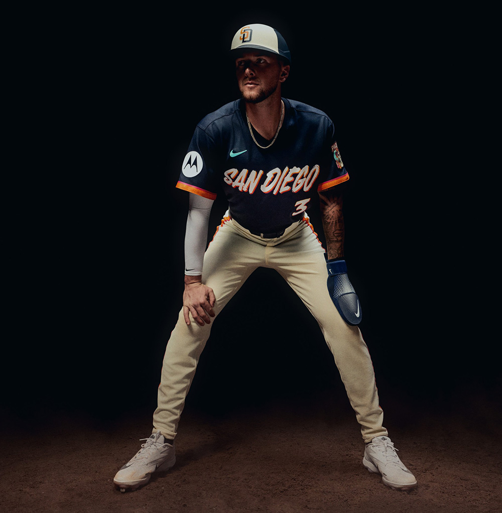 The new set does away with the over-the-top brightness of the old set. Instead, it presents an obsidian blue jersey with bone-coloured pants, a bone-and-obsidian cap, a recoloured “SAN DIEGO” wordmark across the chest, and bright accents in marigold, aqua, fireberry, and Padres gold.