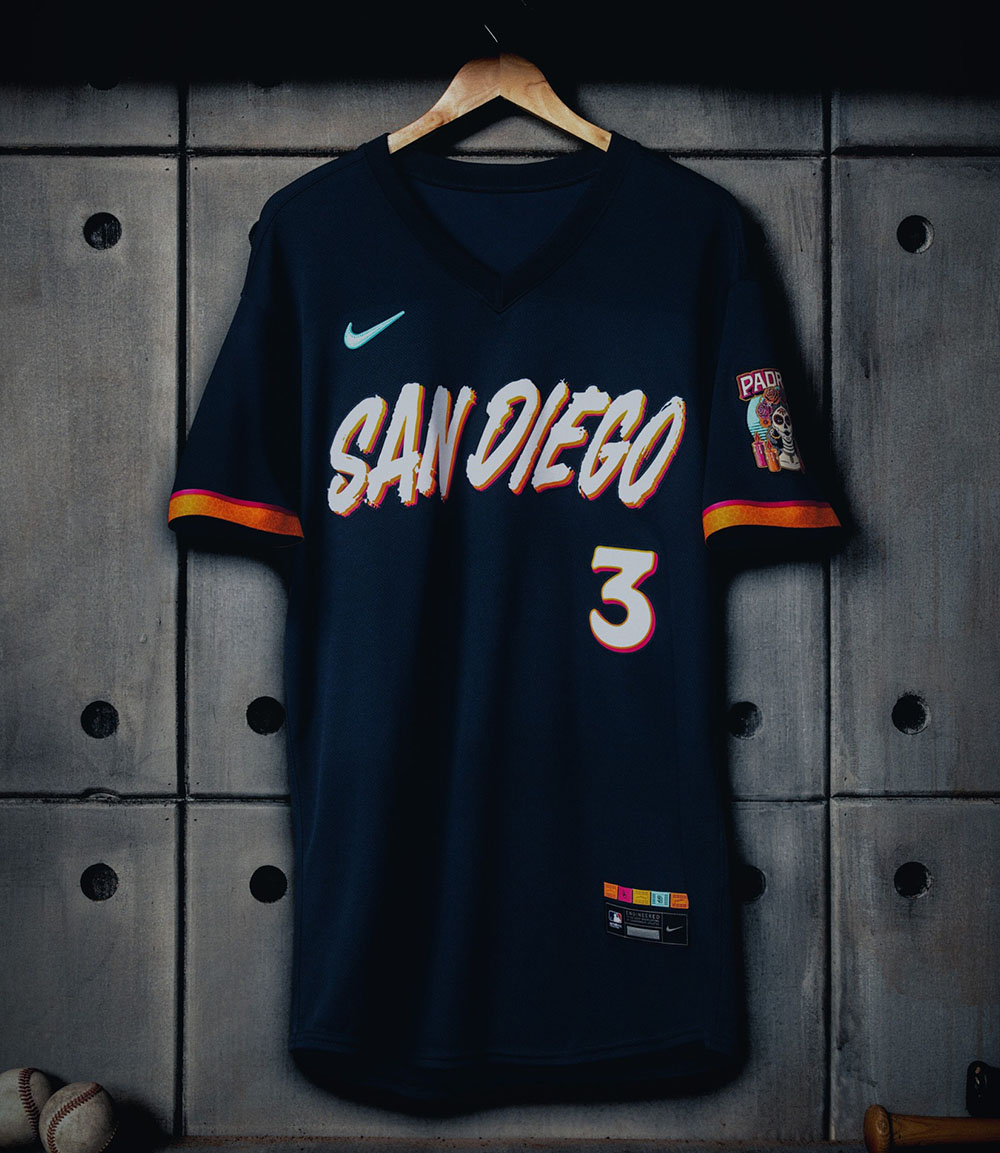 The updated “SAN DIEGO” wordmark now sits in white with an orange dropshadow in a style that’s very close to what was worn with the previous City Connect set. According to the notes we received from the team, the wordmark draws its inspiration from the shared coastline, local sunsets, and the overall active lifestyle of the region. The player’s number sits to the lower left of this wordmark in the same colours and font.
