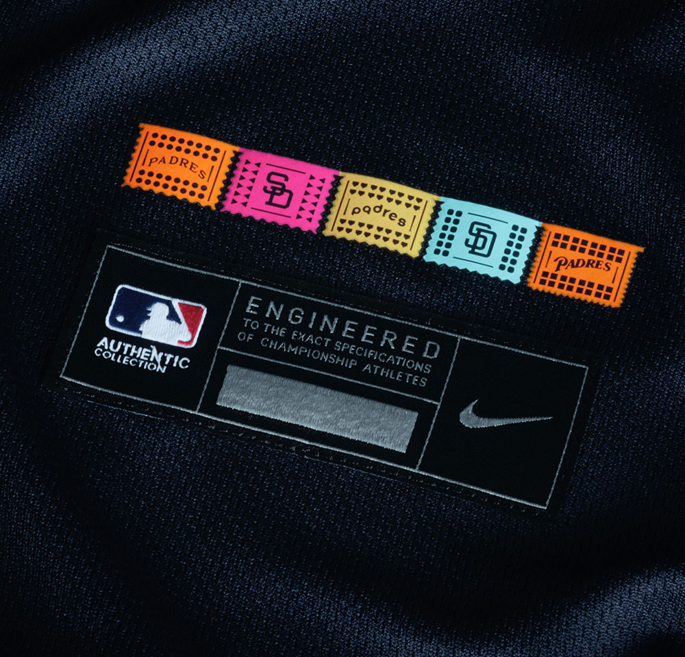 Down at the jock tag, we see “Papel picado” styling along with a fun little timeline of Padres logos throughout the club’s history in orange, pink, yellow, and blue.