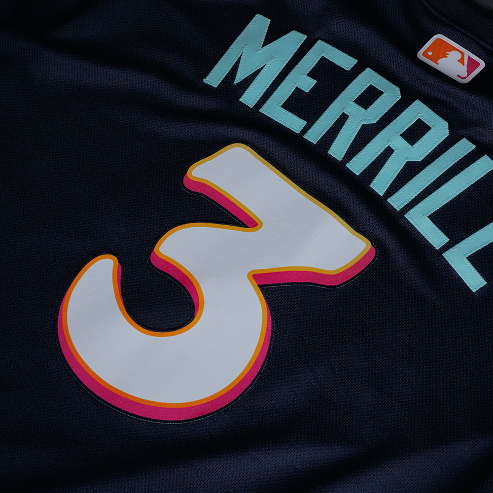 On the back of the jersey, the player’s number follows the same style as the number on the front – white with a pink dropshadow and orange outline. The player’s name is arched above in a block light blue typeface, the MLB logo above all that in an orange/white/pink colourway.