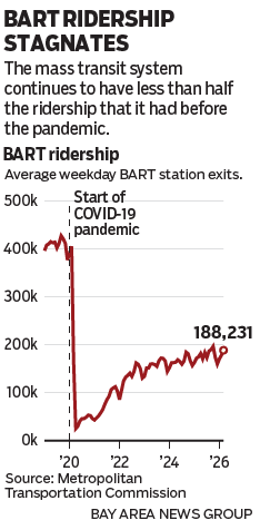 Public transit systems face mounting financial pressure. BART ridership remains about half of its pre-pandemic levels, leaving the agency with a projected $375 million budget shortfall and raising questions about future service.