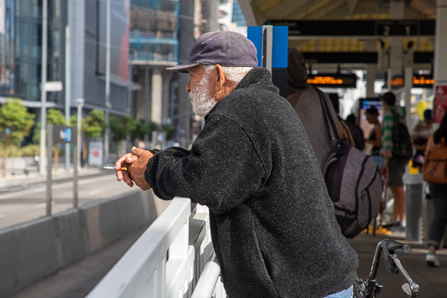 A man smokes a cigarette while waiting for the A Line train on the Los Angeles Metro Pico Station on Nov. 2, 2019. (Richard H. Grant | Signal Tribune)