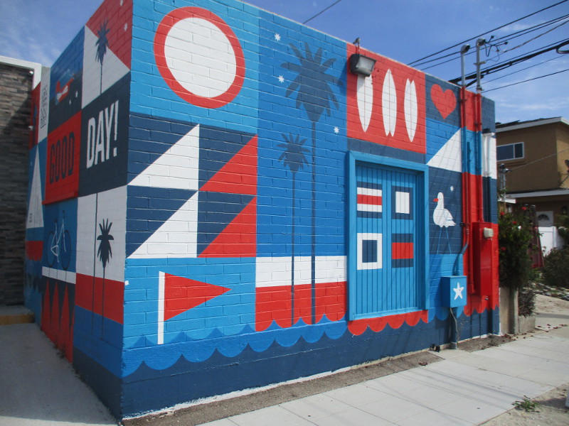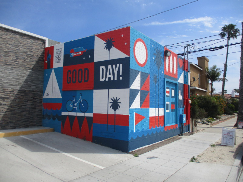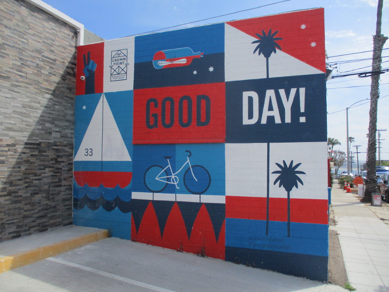 This mural is located in the Crown Point neighborhood of Pacific Beach, a couple blocks from Mission Bay. That explains the bicycle, palm trees, surfboards, shore bird and sailboat graphic.