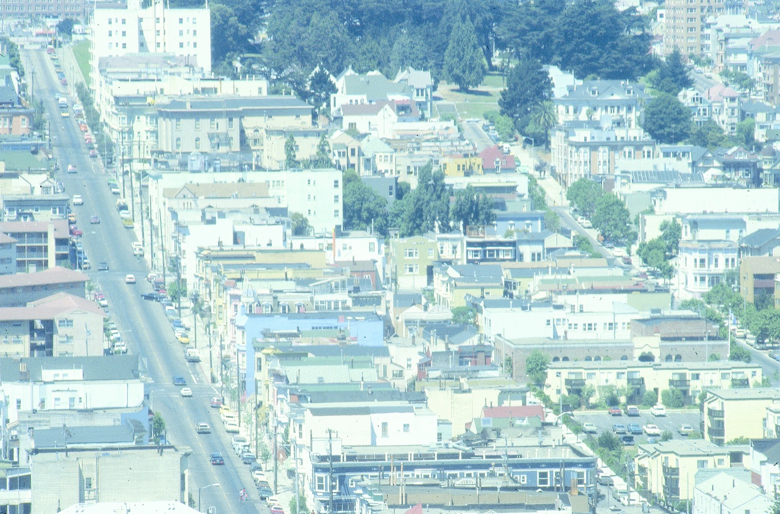 A 1979 telephoto from the 20th floor of 100 Van Ness of the Alamo Square area, east of Alamo Square. The street running along the left side is Hayes Street. Trees in the upper middle are from Alamo Square. (Courtesy of the Max Kirkeberg Collection)