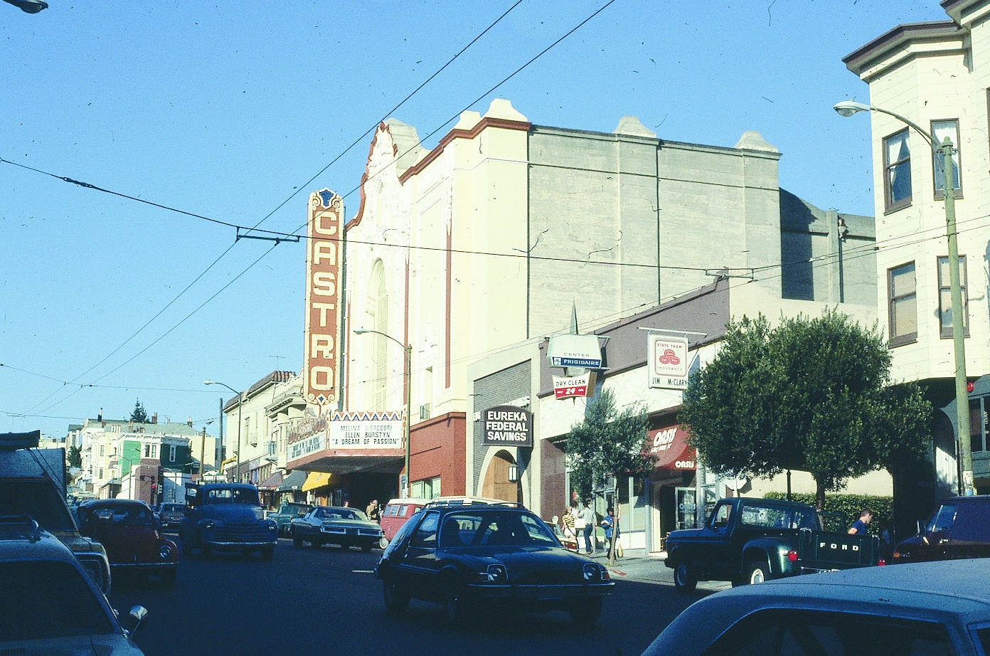 Looking north at the east side of the Castro; Note the laundromat at the middle of the scene. As Castro gentrifies, laundromats on the main streets disappear. (Courtesy of the Max Kirkeberg Collection)