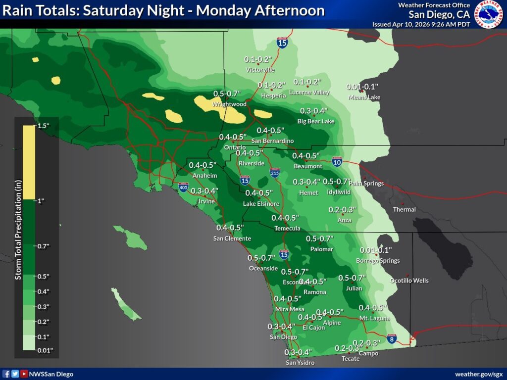 Rainfall totals across the region are expected to vary, with higher amounts in mountainous areas and lighter accumulations in desert regions. The system is also expected to bring cooler temperatures countywide.