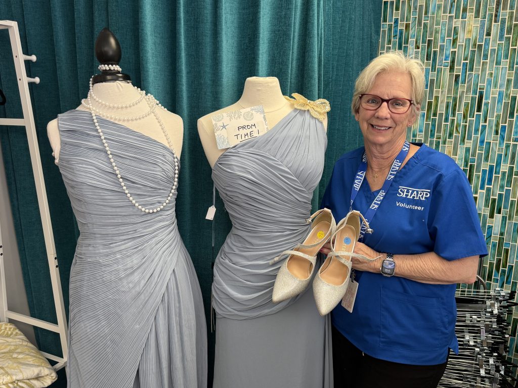 Sharp Coronado Hospital Auxiliary volunteer Sheri Morgan displays some of the current formal attire items for sale at the Second Best Shop at 1513 Third Street, next to the Sharp Coronado Hospital Emergency Room. All sale proceeds benefit the hospital Auxiliary’s projects such as nursing scholarships. Courtesy photo