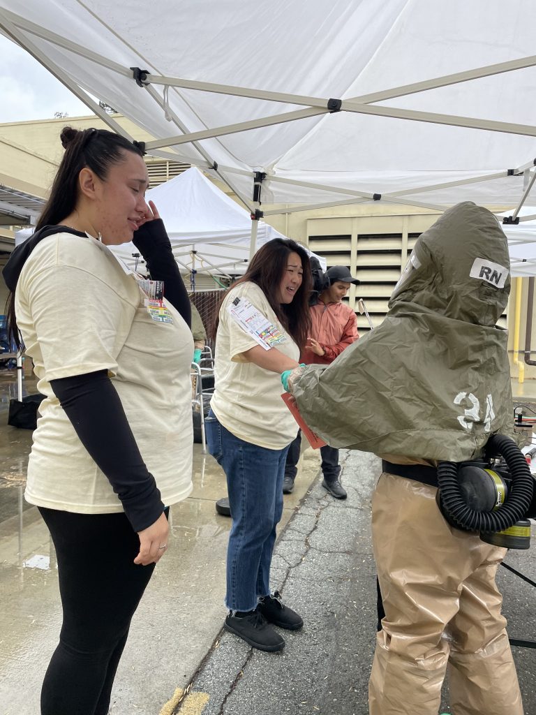 The “patients,” in this case, are nursing students from San Jose State University, who understand all too well that they may one day be on the other side of the equation. They leaned into their roles and tried to make the scenario as challenging and disruptive as possible for the staff. Many of them yelled things like, “My baby! Where is my baby?” and “Don’t touch me!” as they were processed, doing their best to simulate shocked and confused victims.