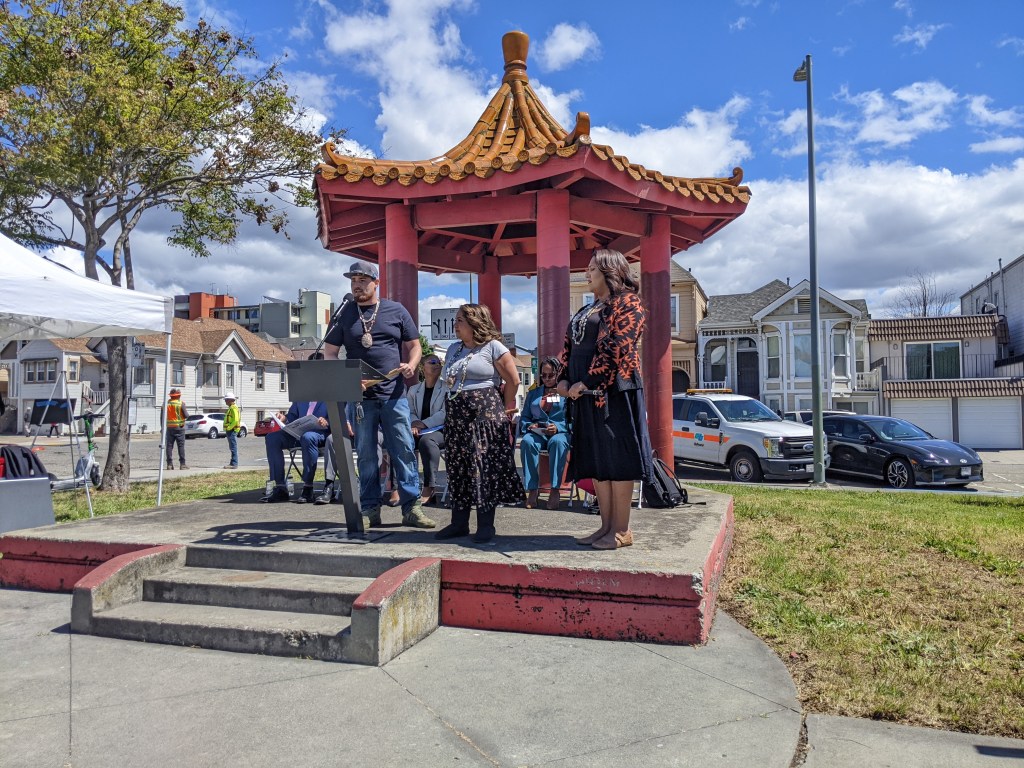 Caltrans had representatives of the Ohlone people perform for the crowd at the pagoda in Chinese Garden Park. Photo: Streetsblog/Rudick