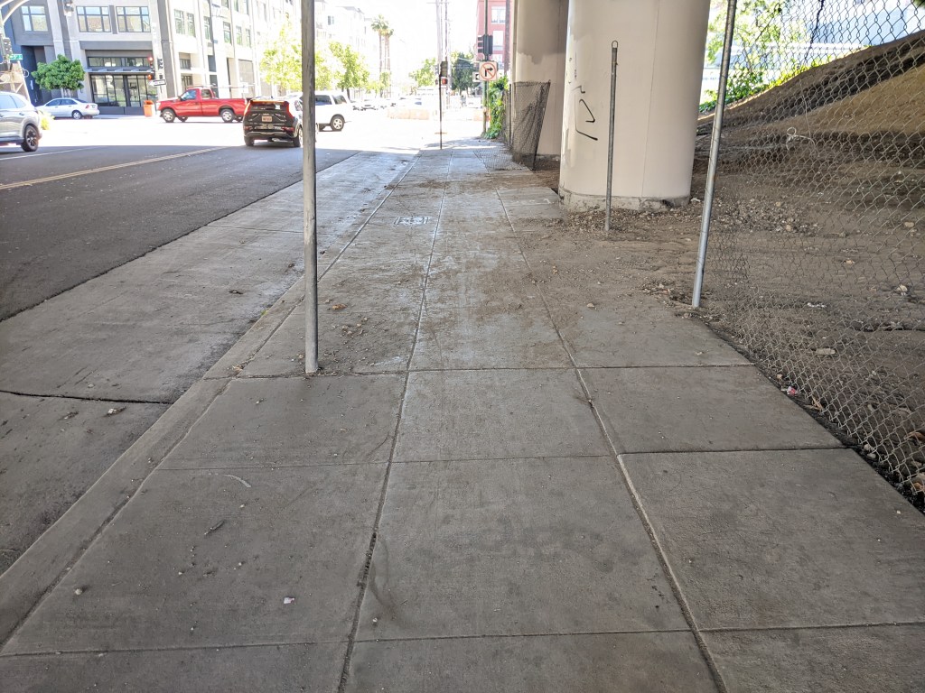 This sidewalk on Jackson is going to be completely removed to become part of a new ramp as part of Caltrans’s pedestrian safety double-talk. Photo: Streetsblog/Rudick