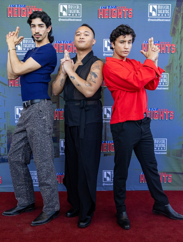 (From left to right) Ensemble members Alonso Melgoza, Elijah Samuél Figueroa and Juan Camilo Laverde pose with gun fingers up in the air during the Musical Theatre West Red Carpet Opening of “In the Heights” on April 11, 2026, at the Carpenter Performing Arts Center. (Samuel Chacko | Signal Tribune)