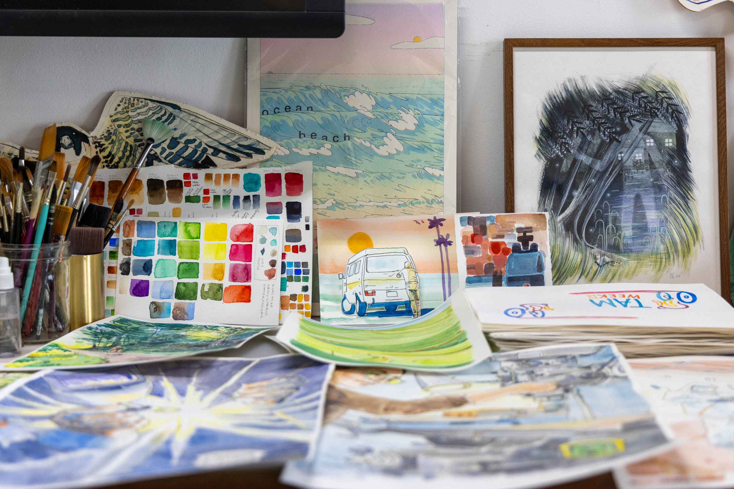 Chris McNally, whose illustrations and watercolors have appeared in The Bikepacking Journal and here on BIKEPACKING.com on several occasions, including the Gunnison Bikepacking Route Network, has a studio space inside the same building as Outer Shell and Sklar. I could have spent hours peeking inside his sketchbooks and flipping through the various prints he had on display. We talked about our experiences traveling in Baja, our love of all-terrain bicycles, and how much fun it would be to own a Honda Trail 125.