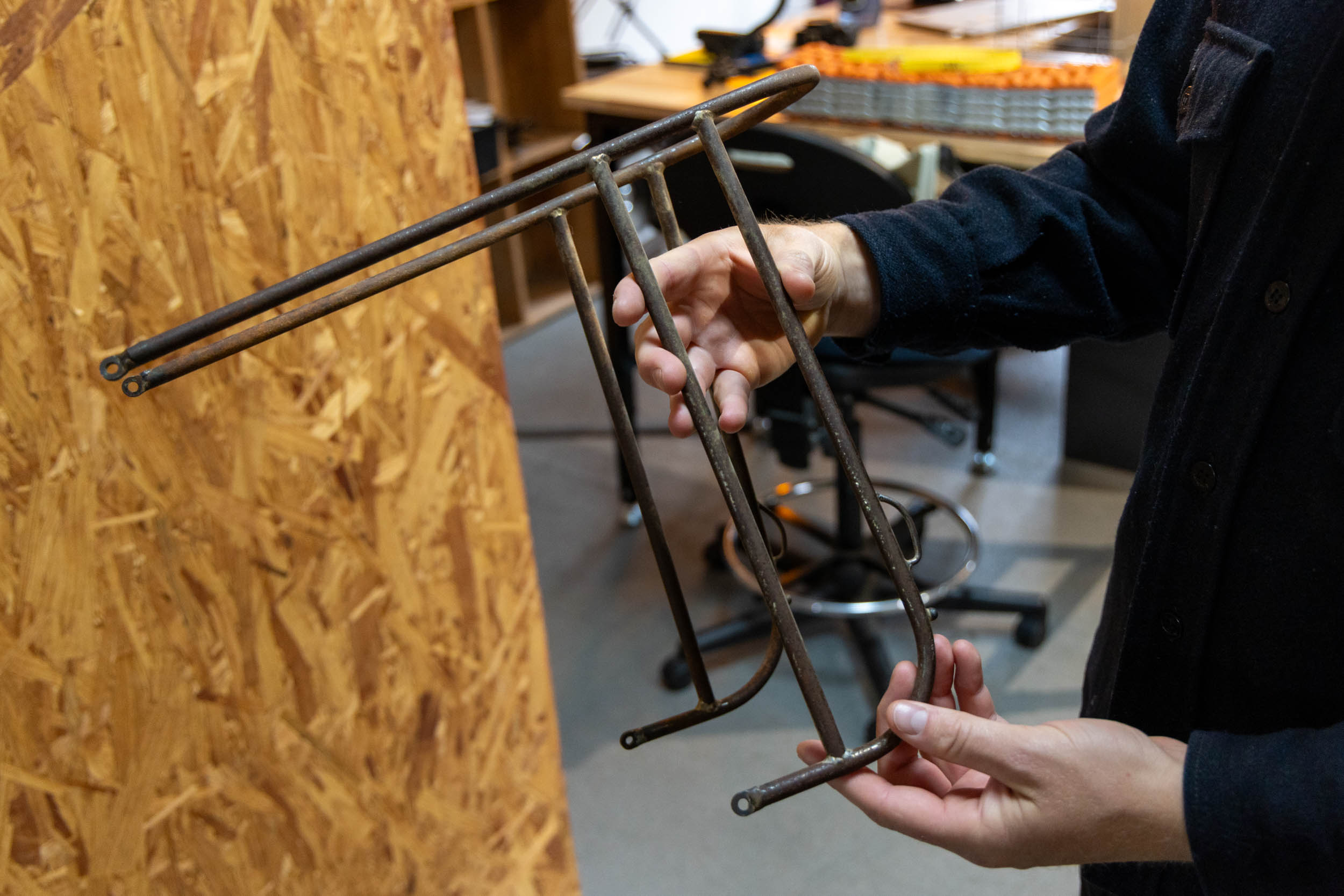 Adam has been removing walls and adding doorways to open up his space. Behind the main workshop is an even larger area stacked to the rafters with frame boxes, ready to be shipped to customers or built up as completes. Near the back of the shop, Adam has four rear rack prototypes hanging on a wall that he has tested over the years. The one pictured above is the rack he used during his 2023 ride on the Tour Divide route, inspiring his upcoming production version.
