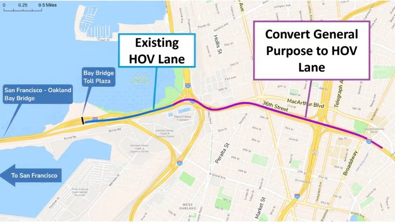 A map shows Project 2: Interstate 580 Westbound HOV Lane Extension of the Bay Bridge Forward. The project, slated to start in January 2027, proposes to convert a westbound general-purpose lane to an HOV lane from just east of the I-980/SR-24 interchange to connect with the existing /HOV lane at the toll plaza approach (just west of the MacArthur maze), a distance of approximately 1.7 miles. (Caltrans via Bay City News)