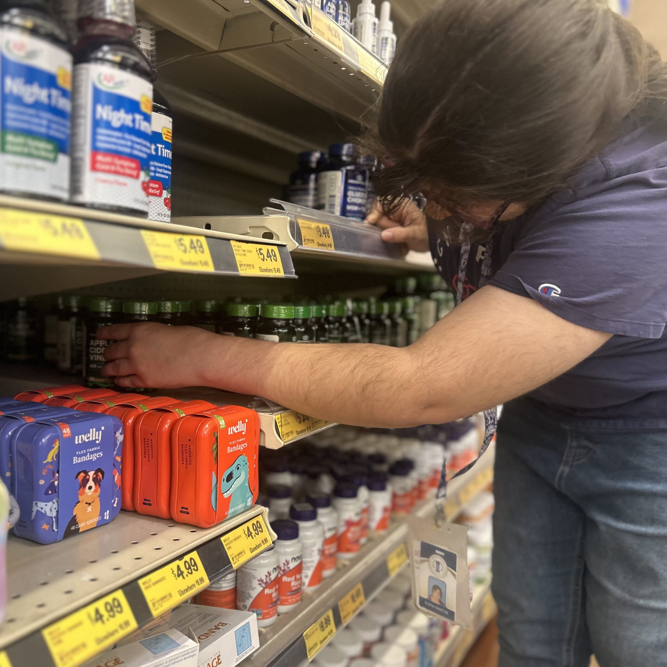 Elena Santos brings over-the-counter medications to the front of a shelf at Grocery Outlet, where she works as part of the Career Adventure Program for students with disabilities. Credit: Lasherica Thornton/ EdSource