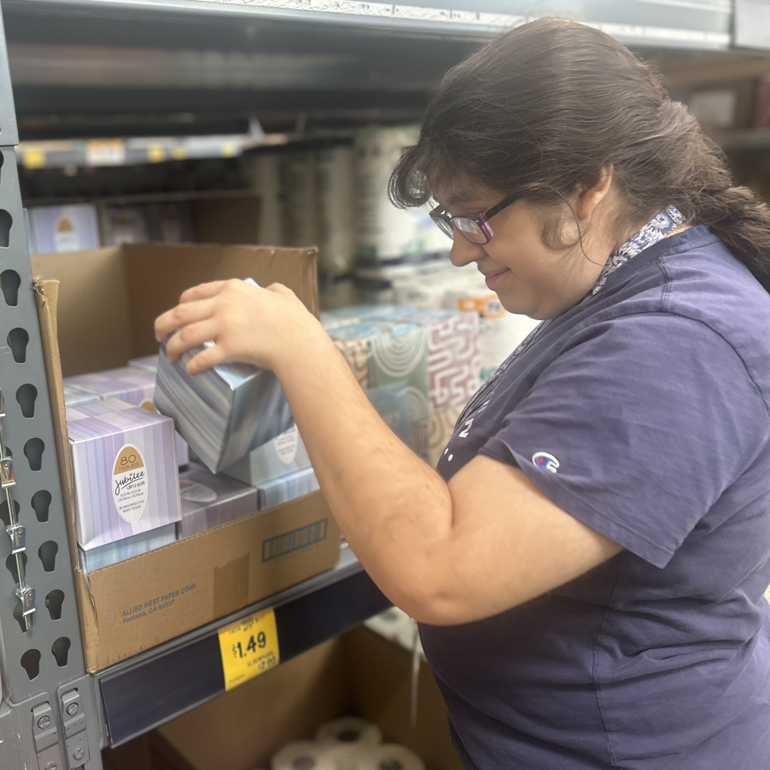 Elena Santos remains focused on organizing tissue boxes at a Grocery Outlet.Credit: Lasherica Thornton/ EdSource
