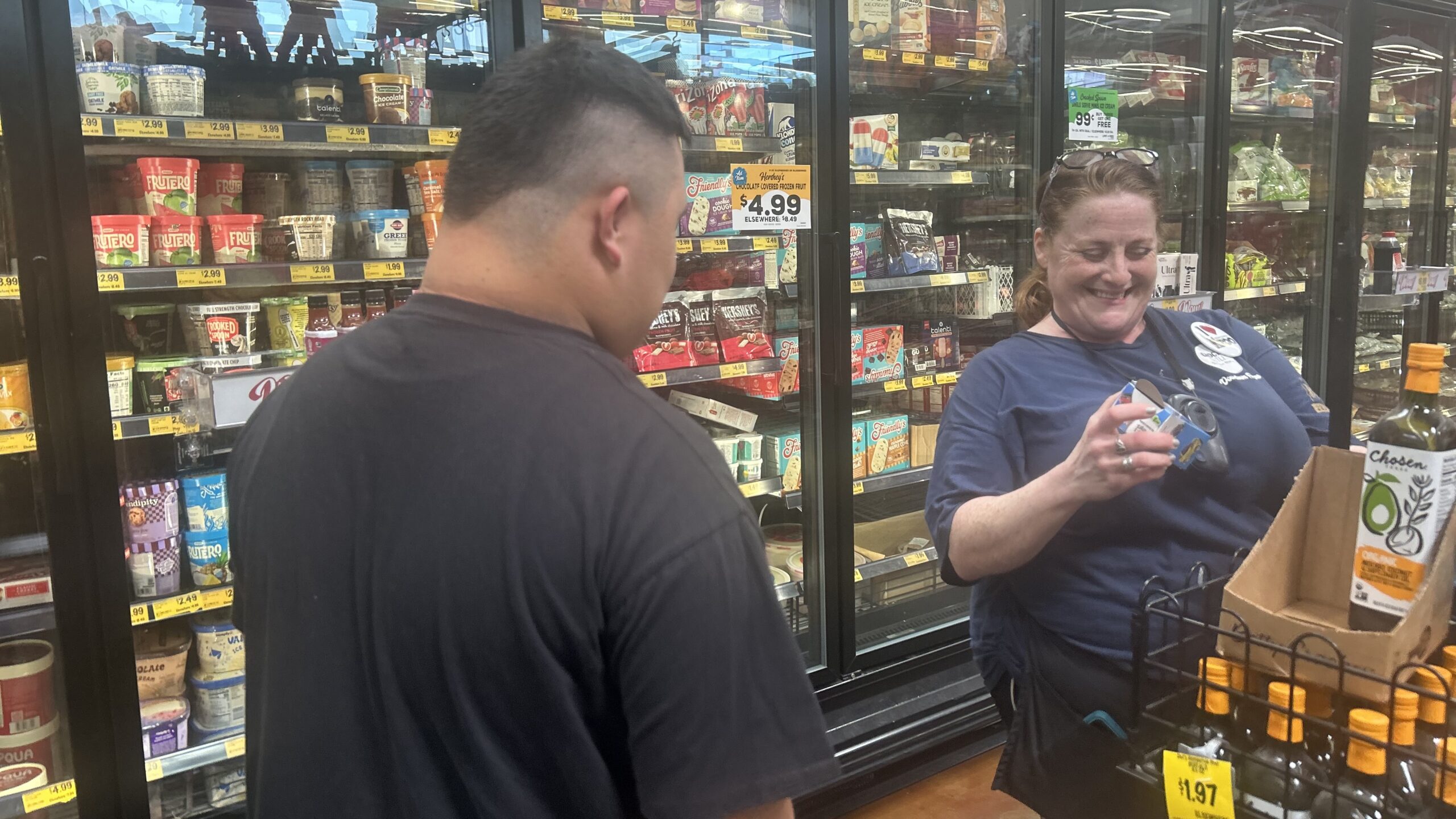 Working at a Fresno Grocery Outlet, Fernando Herrera, who has Down syndrome, informs an employee of an opened item he found during his two-hour shift on March 25, 2026.Credit: Lasherica Thornton/ EdSource