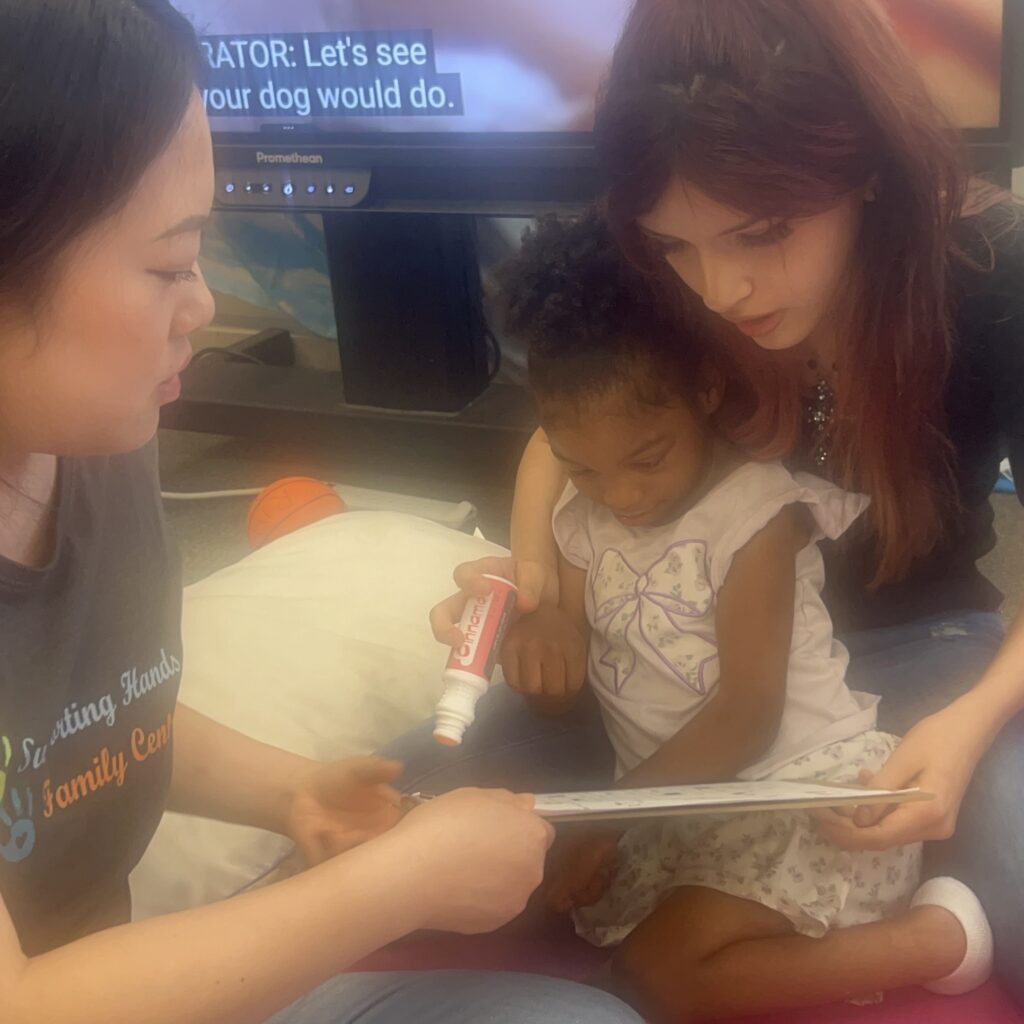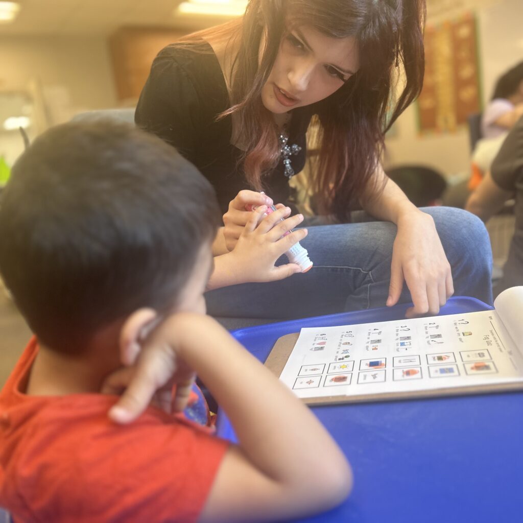 In March, during an extensive support-needs class at Ramacher Development Center, Navarro guided a student’s hand to glue pictures to match words. She sat with another student on a mat on the floor to repeat the same exercise. Even though the students couldn’t respond verbally, Navarro offered encouragement, saying, “Good job.”