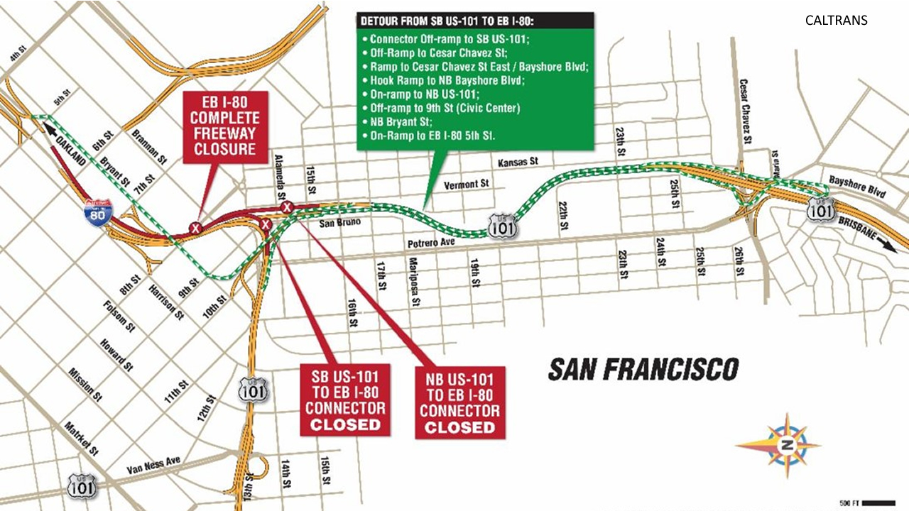 The southbound and northbound US-101 Bayshore Freeway to eastbound I-80 connector ramps will also be closed.