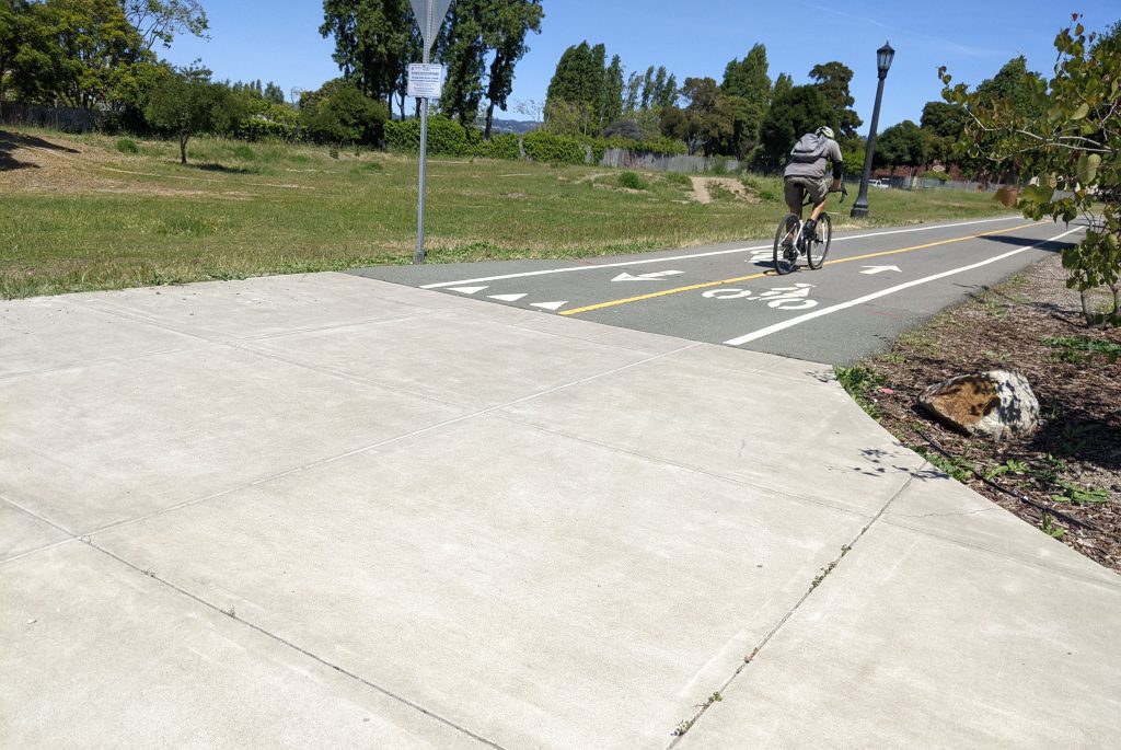 In a few weeks, the city of Alameda will open new ramps to give cyclists and pedestrians direct access between Jean Sweeney Open Space Park and the adjacent Wood Street neighborhood to the south. They’re also building connections to the office park on the north side of the park. This will give cyclists better access to the cross-Alameda trail, about half-a-mile of which cuts through the park.