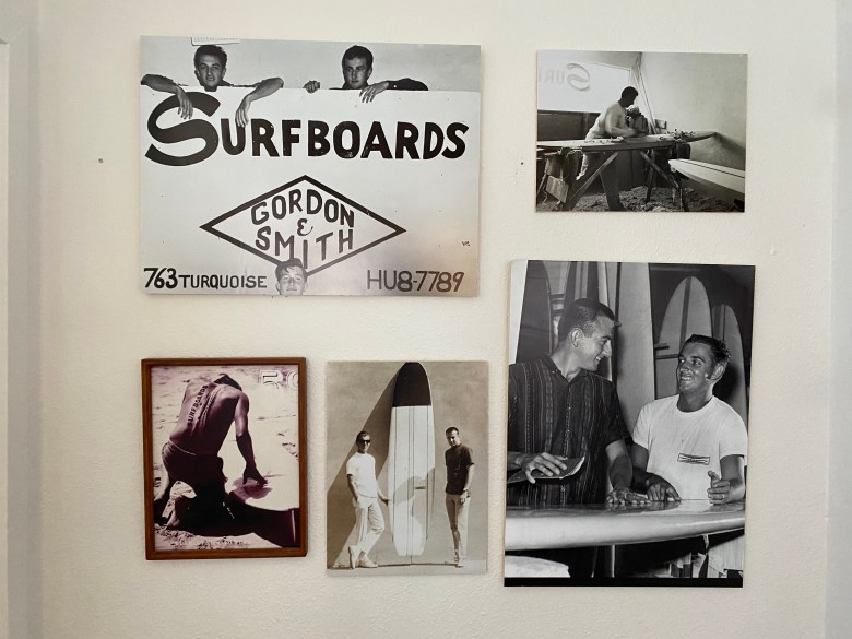 Photos on the wall of the new shop document the beginnings of Larry Gordon and Floyd Smith at 763 Turquoise St. (Photo by Thomas Melville/Times of San Diego)