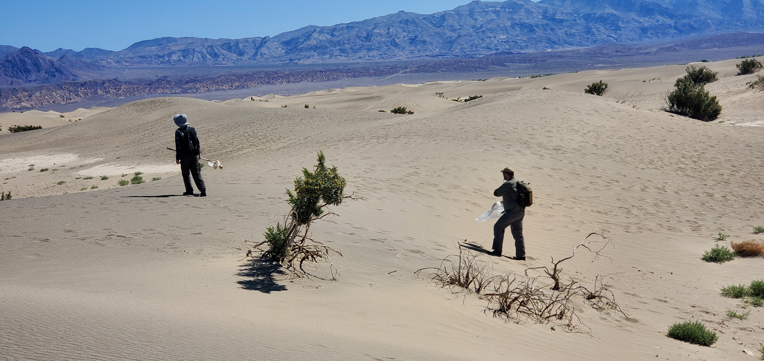 Austin and his technician, Nathan Tang, searching the sand dunes for insects at Death Valley National Park. Image credit Jesse Laine