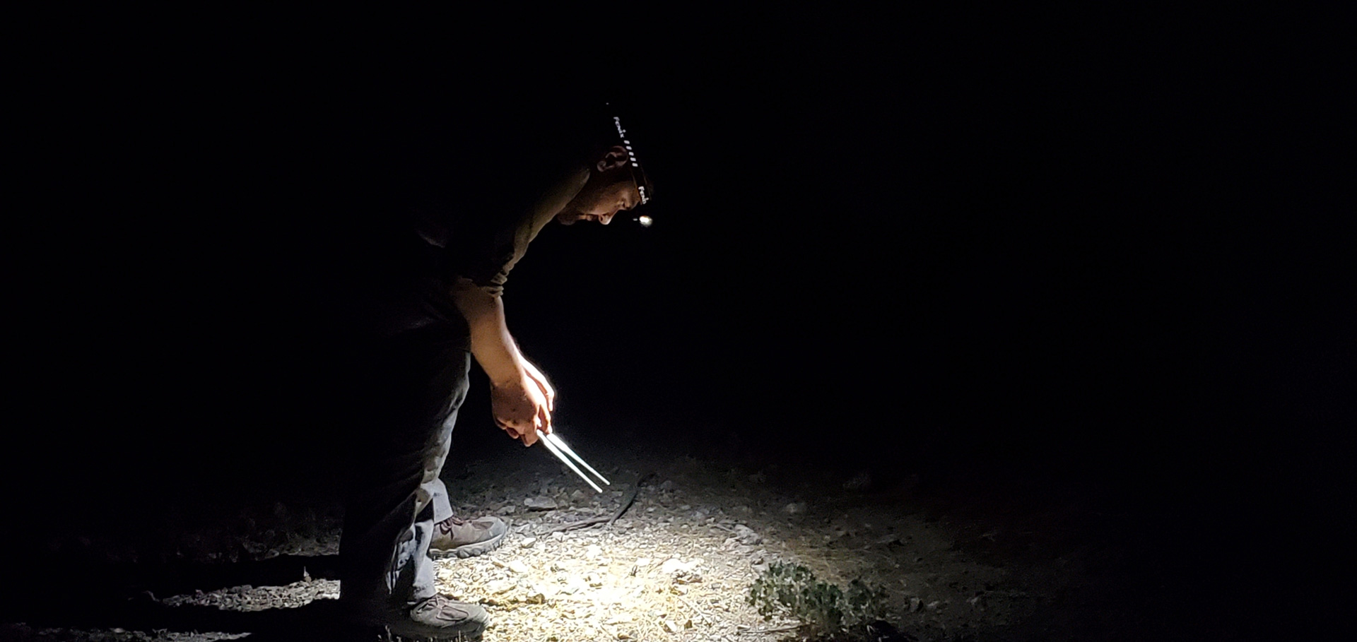 Austin hand collecting beetles at night in the desert. Image credit Nathan Tang and Jesse Laine