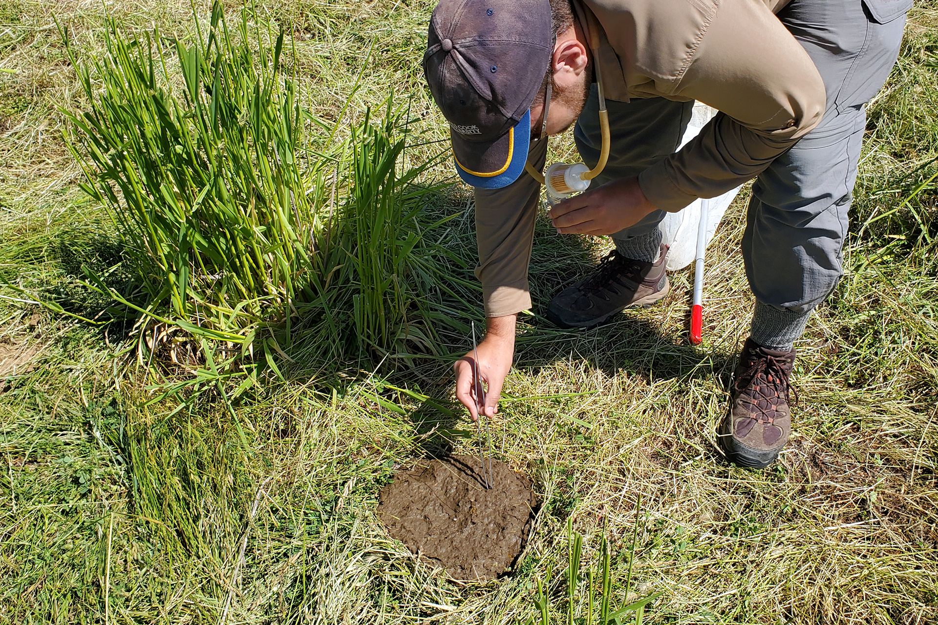 Austin is digging through cow dung for beetles. Collecting is not always pleasant. Image credit Nathan Tang and Jesse Laine