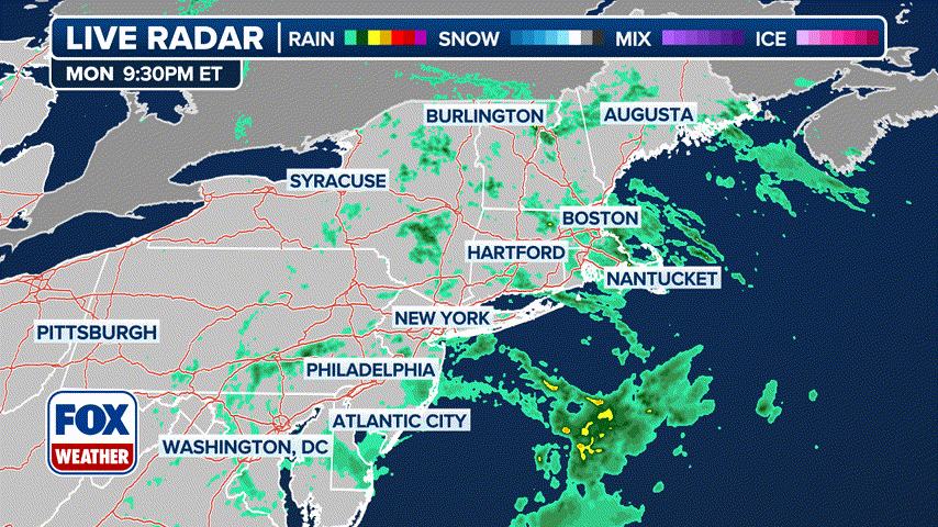 The FOX Forecast Center said heavy rain and gusty winds are continuing to impact communities from Atlantic City in New Jersey northward along the Interstate 95 corridor through New York City, New Haven in Connecticut, Provideice in Rhode Island and Boston.Â