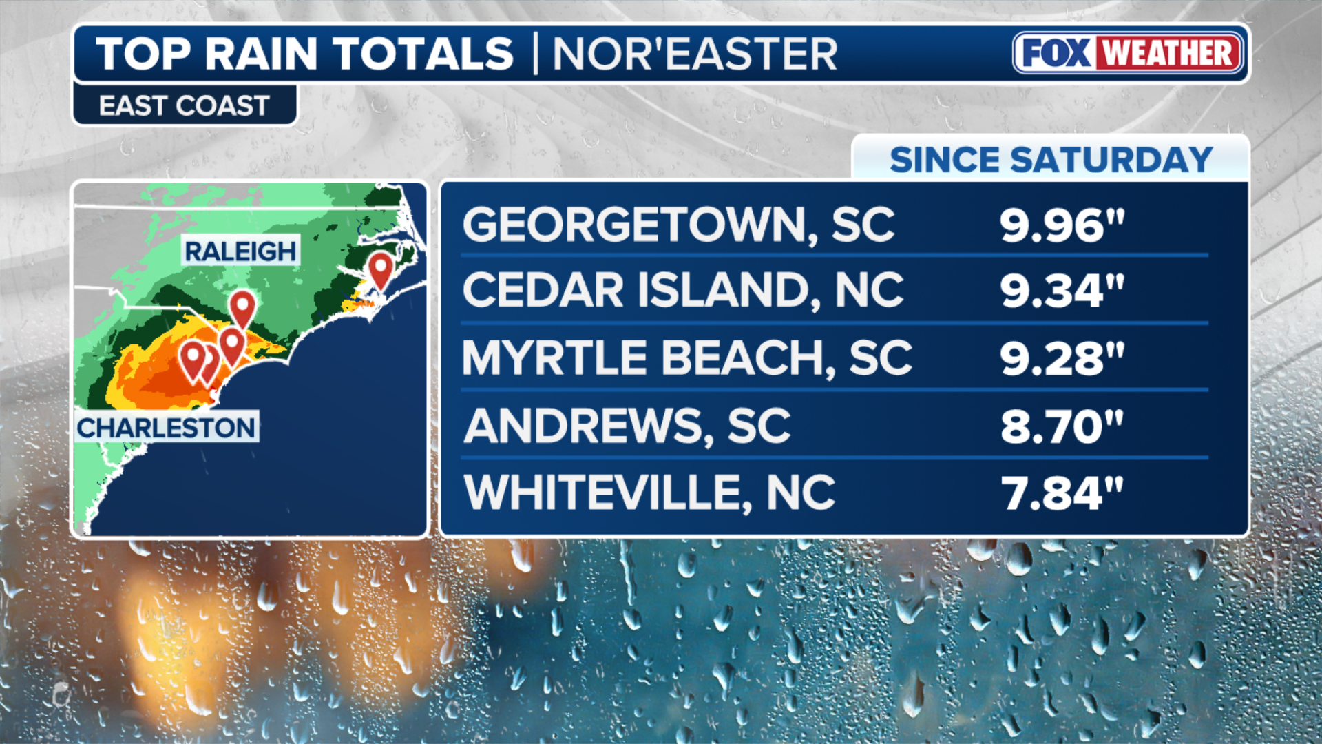 This graphic shows some of the highest rain totals from the nor’easter so far.