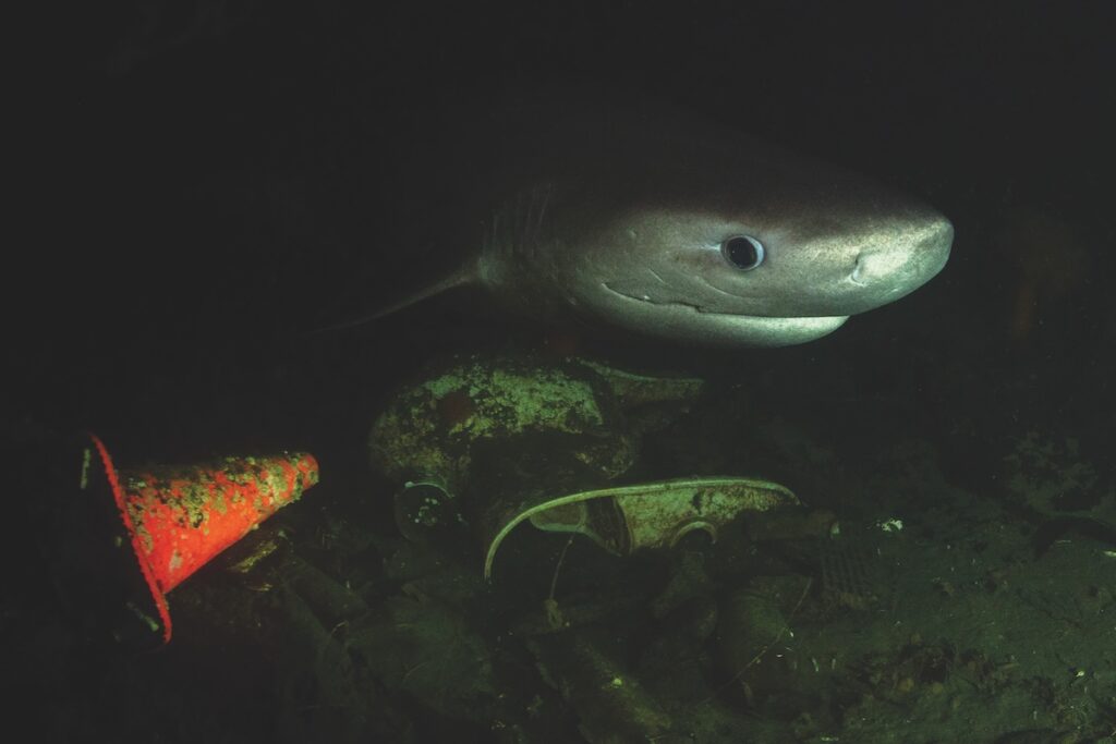 SIXGILL SHARK American photographer Jesse Miller illuminates the contrast between a 200-million-year-old prehistoric animal and the human-created trash at his local dive spot in Des Moines, Washington. (Photo by Jesse Miller)