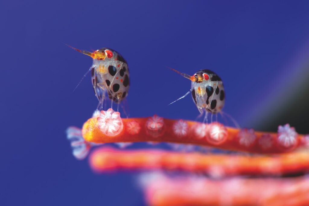 SHOW-WINNING IMAGE Russian photographer Yury Ivanov captures two incredibly tiny marine creatures—amphipods from the Cyproideidae family, commonly called ‘ladybugs of the sea’—resting quietly on coral. (Photo by Yury Ivanov)